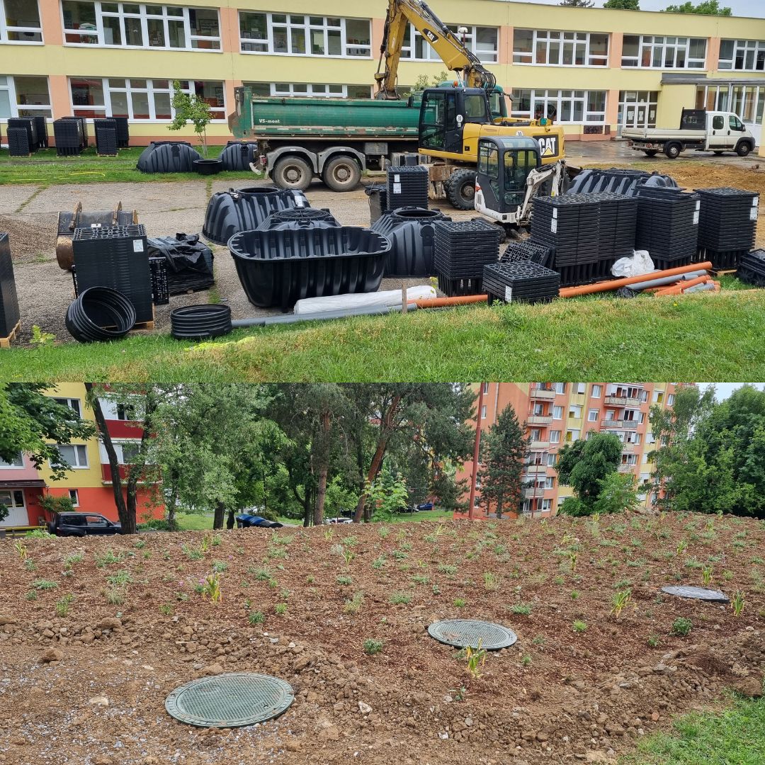 Projekt : Veľký Krtíš.Vodozádržné opatrenia v intraviláne miest a obcí. Štrukturálne fondy EU. Podzemné nádrže CARAT S . Revitalizácia areálu ZŠ a MŠ . Využitie dažďovej vody v exteriéri, systém Garden Komfort . Dažďové záhrady. Automatické zavlažovanie. Vsakovacie bloky Eco blok MAXX.